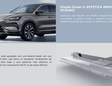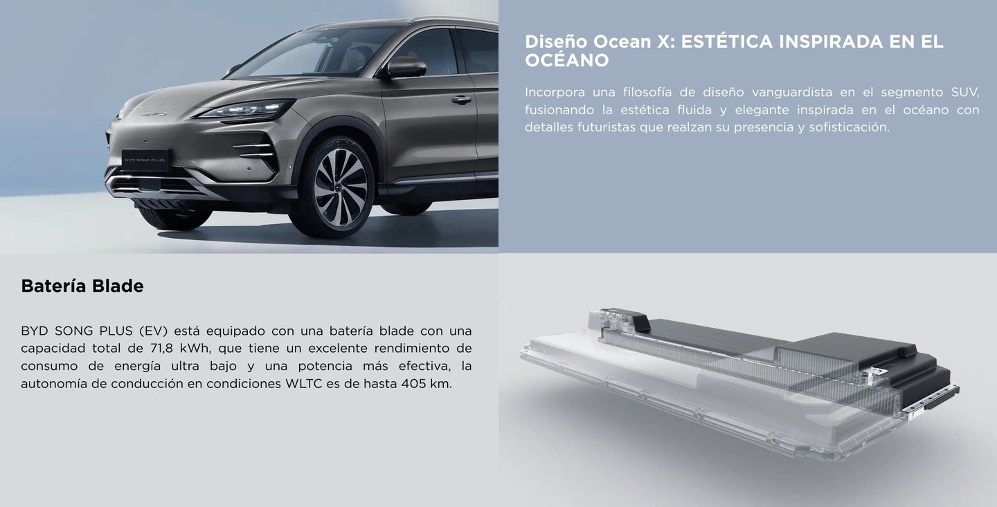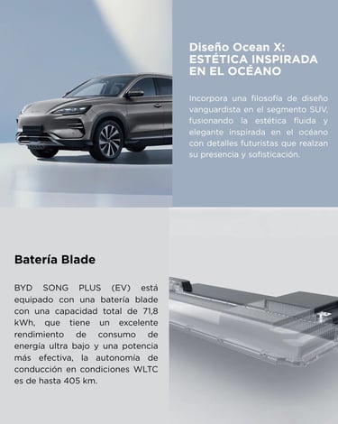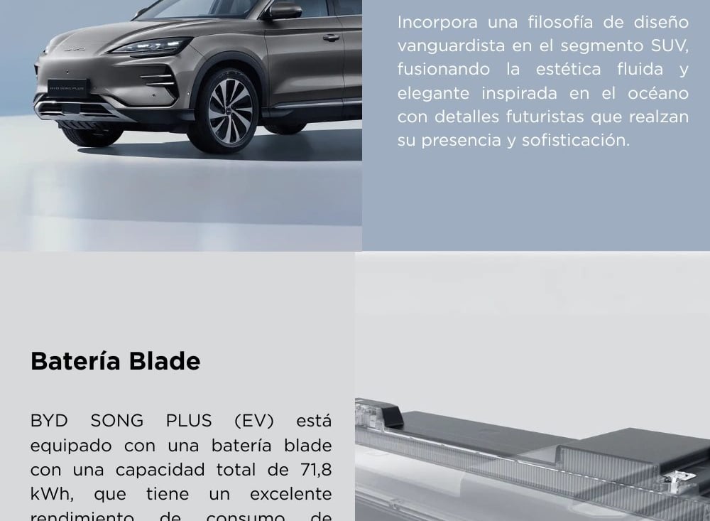 El BYD Song Plus EV Flagship Edition es un SUV eléctrico compacto y elegante, diseñado para quienes buscan gran autonomía, equipamiento de última generación y seguridad avanzada. Su batería Blade LFP de alta capacidad le otorga hasta 605 km de autonomía (CLTC), convirtiéndolo en una de las referencias más eficientes de su segmento.
